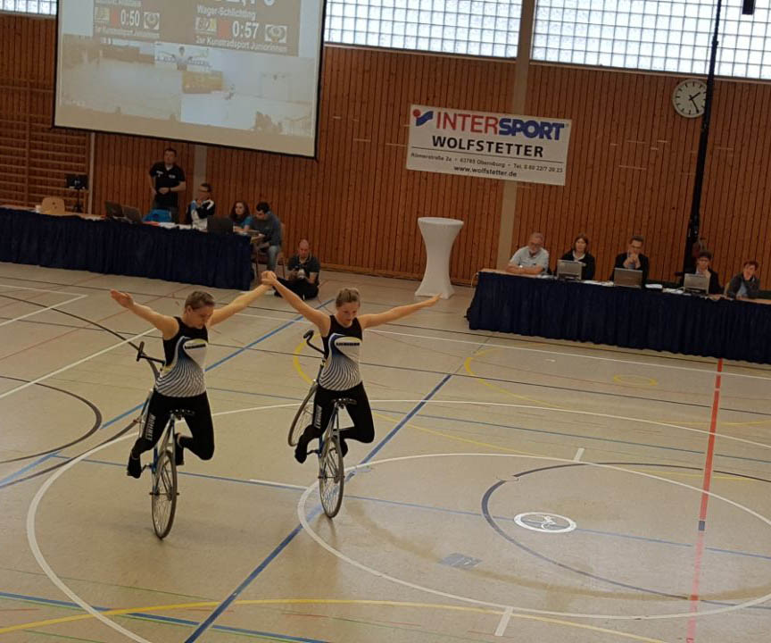 Um ihr Saisonziel - die Qualifikation zur Deutschen Meisterschaft - zu erreichen, mussten die beiden Sportlerinnen unter die besten 15 Starterinnen der Klasse 2er- Juniorinnen kommen. Da Laura und Elisabeth als 15. an den Start gingen, war die Anspannung entsprechend hoch. Dies ließen sich die Beiden aber bei ihrer Kür nicht mehr anmerken. Routiniert und mit einer schönen Ausstrahlung meisterten sie alle Schwierigkeiten ohne Probleme. Lediglich ein kleinerer Leichtsinnsfehler kostete einige Punkte, weshalb am Ende bei einem sehr streng wertenden Kampfgericht 75,09 Punkte stehen blieben.Ganz zufrieden mit der Punktzahl waren die beiden Juniorinnen nicht, da das Ergebnis unter ihren Möglichkeiten und bisherigen Saisonergebnissen lag und für unnötige Spannung bis zum Schluss sorgte. Die Punktzahl war jedoch in dem Moment nachrangig, als sie erfuhren, dass sie sich sogar als 14. zur Deutschen Meisterschaft qualifiziert hatten.