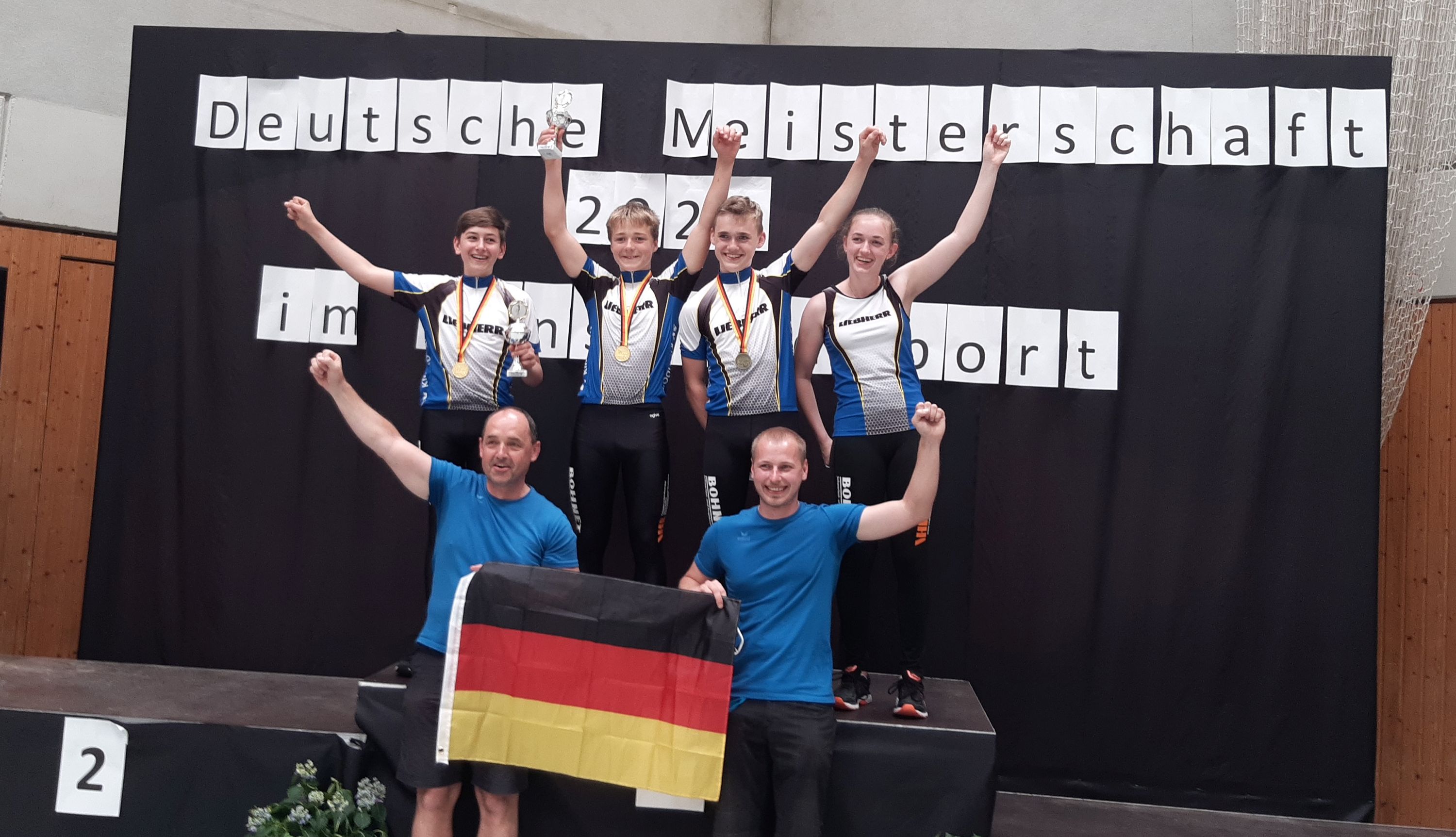 In Amorbach/Bayern fanden am Wochenende die Deutschen Meisterschaften im Kunstradfahren der Junioren und Schüler unter einem strengen Hygienekonzept statt. Der SV Kirchdorf konnte sich hierbei gleich über 2 Podestplätze freuen. Adrian Bast und Maximilian Keller wurden Deutsche Meister im 2er der offenen Klasse der Schüler.